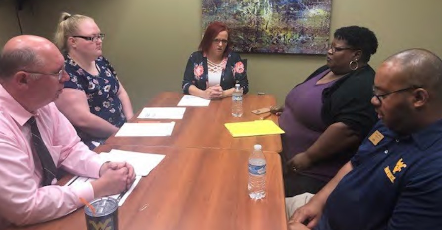 Tiffany Tyson and Kevin Jackson, Transition Agents for Jobs and Hope West Virginia, met with Charleston administrators recently to help form a partnership with Dismas Charities to help our residents. Jobs and Hope, which was formed to help newly-released state and federal inmates make a successful re-entry into society, assists with transportation to job interviews, resume writing, birth certificates, and identification. They also assist with obtaining needed work shoes, tools, and uniforms necessary on the job. “The state of West Virginia has taken a very proactive approach to providing as much assistance as possible to those returning to our communities from incarceration,” said Director Jim Sands. Pictured from left are Sands, Social Services Coordinator Amy Bess, Counselor Renae Bailey, Tyson and Jackson.
