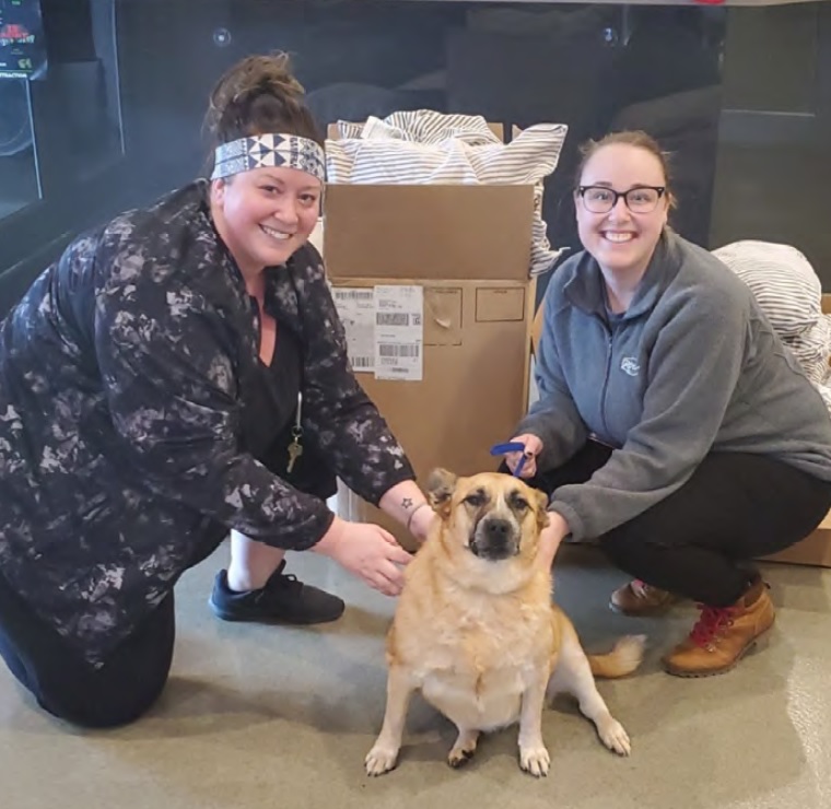 In early November, the Dismas Charities Kearney Nebraska program donated pillows to the Kearney Area Animal Shelter (KAAS), a no-kill facility funded primarily by donations. Thanking and greeting Resident Monitor Banna Muirhead (left) and Social Services Coordinator Rachael Anderson (right) is Boomer, a resident of the KAAS.