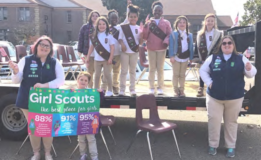 Tupelo Director Tina Johnson (right) has taken on the awesome responsibility of being a co-leader of a Brownie Scout Troop. Together with her childhood friend, Katie Flandro (left), she has been busy helping the eight second and third graders earn their merit badges. The new troop, known as the Shooting Stars, recently earned their Community badge by participating in the Veterans Day parade, singing patriotic songs to the veterans, and dispersing programs at the performance.