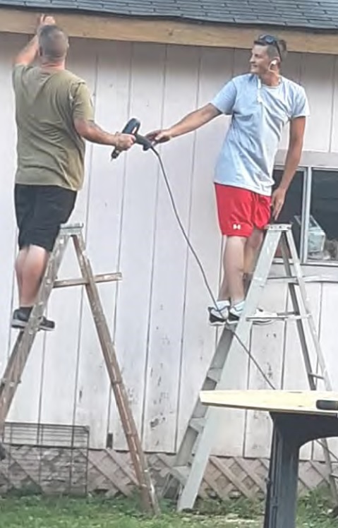 had no trouble finding resident volunteers. Schoonover explained that counselors actually have a waiting list of residents wanting to work with local community partner, K9s to Furkids. K9s trains service dogs and donates them to veterans and low-income families who cannot afford the customary costs involved with obtaining a service dog. The non-profit also rescues dogs under nine months old to determine their viability for service dog training or placement as a family pet. In early fall, a microburst storm damaged K9s toFurKids flattening several kennels. “Our residents responded with enthusiasm at the prospect of spending time … with the dogs,” the Director said. Above are residents Lee Young (left) and Charles Wright.