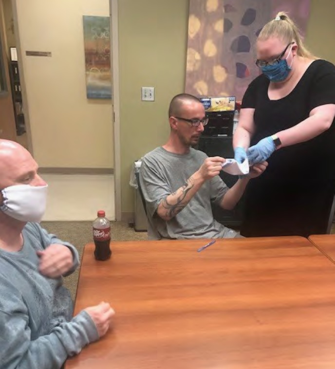 Charleston Social Services Coordinator Amy Bess instructs new residents on how to make personal face masks. The masks are but one of the procedures the facility has implemented for new arrivals including providing them clothing while their clothes worn from the institution can be washed. They are also provided hygiene items upon arrival.