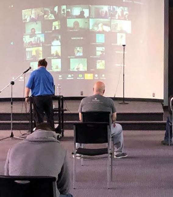 Support Services Coordinator James Campbell (standing) helped arrange for a virtual AA meeting at the St. Ann campus. The event was so well received that the attendees requested more virtual meetings. Notice the “social” distance between the chairs.