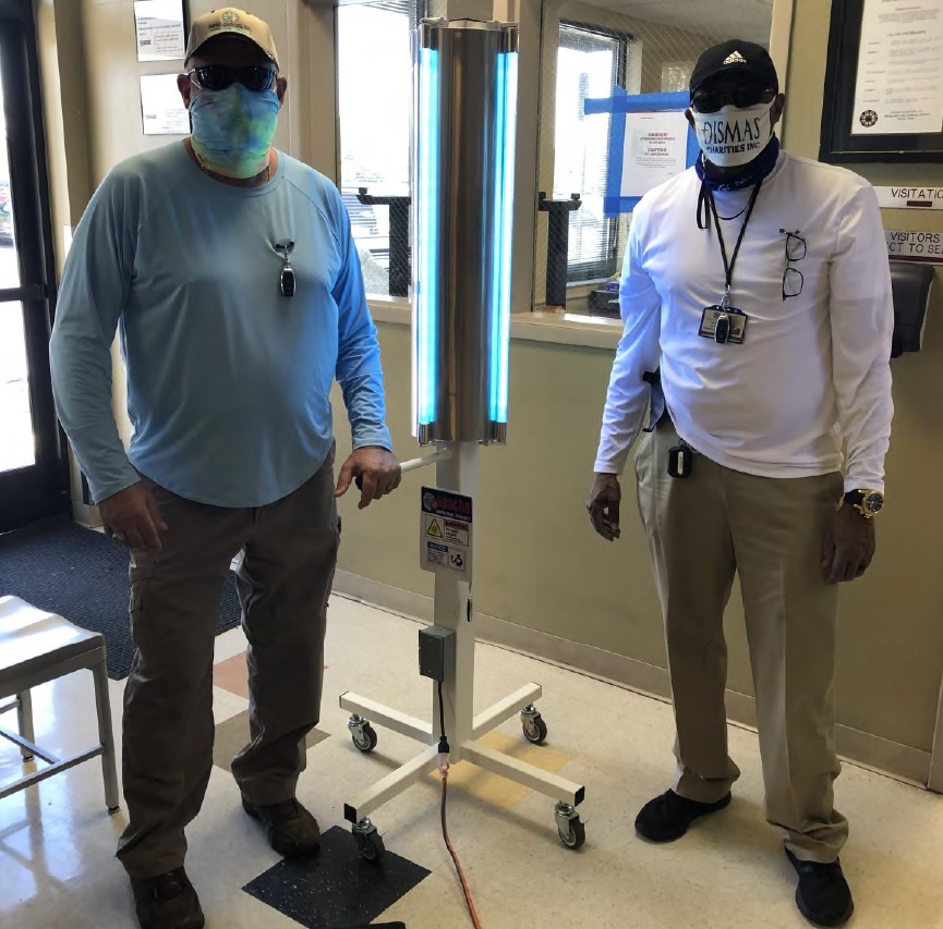 It’s nickname is the “Covidnator”, but it’s title – the Apache Tomahawk 2000 UVC Germicidal Light Tower – is much more impressive. And Dismas Charities has two of them to help the organization fight the COVID-19 pandemic. The portable Ultraviolent Germicidal Irradiation (UVGI) light tower, pictured above between National Risk Manager Tony Davenport (left) and Regional Vice President Joe Driver, is designed to sanitize an entire dormitory or other space using a sophisticated germ-killing lighting mechanism. Davenport, who along with Driver, received special training on the operation of the device in mid-May, said a deep hand-cleaning of all hard surfaces with a bleach solution, must follow its application. “UVGI has been effective in hospitals and other sterile settings for more than 50 years but very new to our setting,” Davenport said. “Once again Dismas Charities leads the way.”