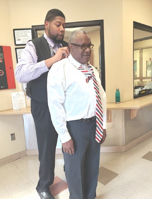 Before signing out for a job interview and prior to the COVID-19 pandemic, Resident Douglas Freed (right) needed help with his tie. Resident Monitor Martez Arnold came to the rescue by adjusting the uneven and backward knot.