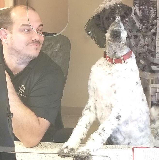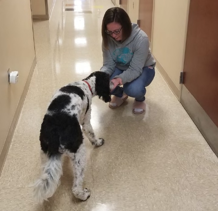 Rosie, a two-year-old Pyredoodle, is registered as a diabetic alert dog. She also serves Clarksburg West Virginia residents with her calming nature, relief from anxiety and loneliness, encourages communication, and reduces blood pressure. Rosie roams the facility and interacts with residents and staff alike. Here she poses for the camera with Employment Specialist Charles Owens.