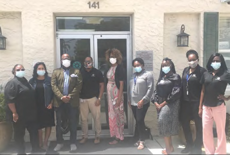To show their appreciation for making a substance abuse and mental health grant a success, the staff of Workforce Development for the Opportunities Industrialization Centers of South Florida (OICSFL) had lunch delivered to all Dismas Charities Dania Beach staff in early September. Anthony Robinson, OIC Director wrote the following: “On behalf of all of us at OIC and the SAMHSA Team (Substance Abuse Mental Health Services Administration), we are extending our sincere thanks to all of the staff at Dismas who helped to make this 3-year SAMHSA grant a success. Without you and our teamwork this program could not have been a success.” The grant was used to help individuals with substance abuse or a mental health history with counseling and to offer a diversity of programs, training and job placement. SAMHSA is the agency within the U.S. Department of Health and Human Services that leads public health efforts to advance the behavioral health of the nation. SAMHSA’s mission is to reduce the impact of substance abuse and mental illness on America’s communities. From left are Dania Beach Assistant Director LaShonda Adams, Director Ivonne Cavanaugh, Robinson, Employment Specialist Keenan Royes, OIC-Program Manager Karen Perry, OIC-Case Manager Nicole Gooding, and Counselors Kianna Bonner, Beverly Smart and Donaya Hamilton.