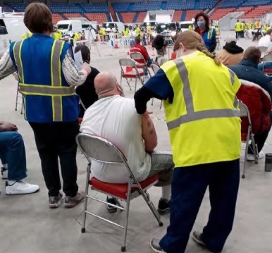 On March 9, Regional Vice President/Portland Director Robert Lanning arranged to have 101 Dismas Charities residents from all four Louisville-area centers vaccinated against the COVID-19 pandemic. According to Lanning, Portland Resident Monitor Frank West and St. Patrick Resident Monitor Charles Perkins drove a total of 11 round trips from downtown Louisville to Broadbent Arena at the Kentucky Fair and Exposition Center for a total of 176 miles. The number of residents participating from each facility was Portland, 49; Diersen, 14; St. Ann, 20 and one staff member, and St. Patrick, 18. Lanning’s efforts did not go unnoticed. “What a testament to the memory of Fr. Diersen in our service to and for our residents,” said President/CEO Ray Weis. “Thanks to All the Dismas Teams.” Executive Vice President Jan Kempf said “The impact of your actions will continue to impact and protect so very many people. This is so exciting. Thank you from and for Team Dismas.” Vice President of Business Development Steve Vice noted that “Sometimes Healing the Human Spirit is also healing the human body.”