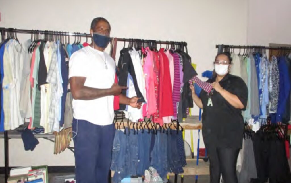 Midland Resident Isaac Golden (left) and Word Processor Angelica Montez collected and organized clothing donations from community members. Items included purses, shoes, sweaters, jackets, and pants. “Clothing donations are always needed especially for residents who are indigent and do not have the means or family support to purchase or receive clothing,” said Director Amy Vest.