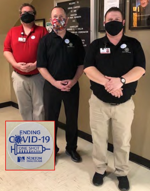 From left St. Ann Support Services Coordinator James Campbell, Director Mark Meredith, and Counselor Christopher Kaelin proudly display their COVID-19 vaccination sticker after they received their second dose of the vaccine in early February.