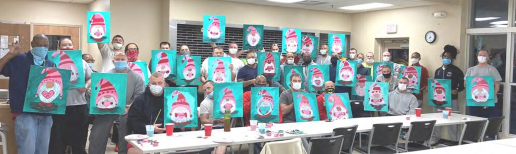 In mid-February, Kat Baker, of Pinot’s Palette, a “paint and sip” art studio in suburban Louisville, donated a large amount of art supplies for the entertainment of residents of the Portland facility. The gift included 50 canvases measuring 16X20”, all the paint and paint brushes needed for an enjoyable artistic session, and access to their online, virtual course. The participating residents were given the opportunity to make their own choices. They chose to produce “Rosey Gnome”. The residents have Administrative Assistant Kim Rowe to thank for making the initial contact with Baker. According to their website, Pinot’s Palette started in Houston and has studios throughout the U.S. and internationally, and partners with local charities to support worthy causes.