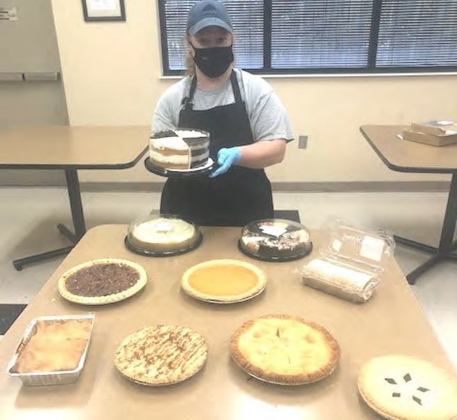 When a black sedan entered the parking lot of the Charleston facility, Director Jim Sands, noting that visitors haven’t been allowed since March, went to investigate. The car, Sands found, was occupied by the mother of a resident who wished to remain anonymous, but wanted to donated baked goods to the residents to show her appreciation for her son’s treatment while at Dismas. “Our anonymous donor said she feels like Dismas has assisted her son in finally ‘breaking the chains’ that have bound her son to the revolving criminal justice system door,” Sands said. She donated cheese cakes, peach cobbler, apple, pumpkin and pecan pies and other baked goods that were all prepared by Cook Leighann Harmon (pictured here).